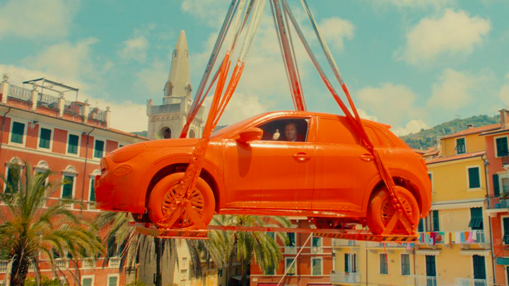 Gezeten achter het stuur van de nieuwe Fiat 600e, neemt Fiat CEO Olivier Francois een duik in een kleurenbad onder het motto 'ITALIË. HET LAND VAN DE KLEUREN. FIAT. HET MERK VAN DE KLEUREN'.