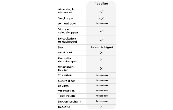 Ontdek alle details van je nieuwe Topolino & Topolino Dolcevita en kies de versie die het beste past bij jouw levensstijl en behoeften..