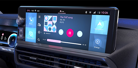 At FIAT Professional, enjoy a smooth, intuitive, andsecure infotainment system. Benefit fromconnected navigation with real-time map updates,connectivity to access your apps and media, remotesoftware updates, real-time services like weatherand restaurant recommendations, and advancedsafety and personalization features. These featuresnot only enhance the driving experience but alsocontribute to safety and convenience.